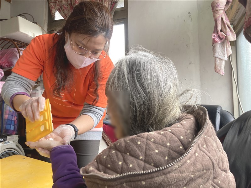 張晉僖考量美櫻阿姨的視力問題,會耐心講解用藥說明,並注意服用。圖/弘道老人福利基金會提供