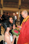 住持滿信法師以七寶念珠做為新人祝福禮,並以星雲大師所著的祈願文祝福新郎新娘相互扶持,開創生命的新旅程;典禮後,男女雙方在滴水坊宴請客人。