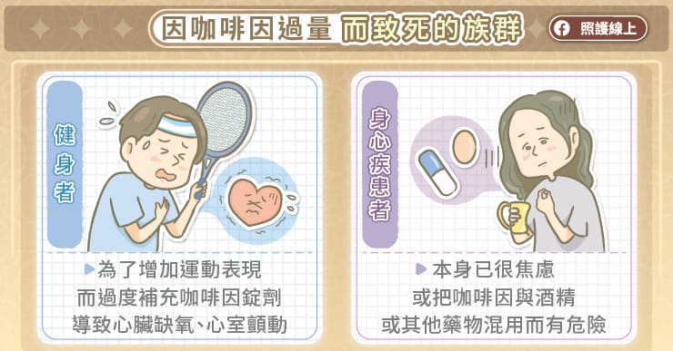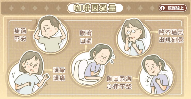 咖啡因過量會怎樣?多少算過量? |2022.05.16 語音朗讀 2339觀看次 字級 大 中 小 咖啡因過量會頭暈、開始拉肚子、覺得口很渴、變得睡不著且焦躁不安、有時也會出現頭痛。圖/記者張睿杰 【本報台北訊】「我每天如果不喝咖啡,根本撐不下去!」大家上班是否也有這樣感覺?需要先買杯香醇咖啡為美好一天揭幕,有時一天甚至會喝2~3杯咖啡,有人可能一天還喝5~6杯咖啡,你是不是有想過「我這樣會不會咖啡因中毒?」咖啡與茶是台灣人熱愛的飲品,兩者都含有咖啡因。除此之外,可樂、巧克力、能量飲料,甚至部分市售止痛藥裡面,都含有咖啡因。咖啡因是天然的提神劑,會刺激中樞神經系統,導致心跳加速、血壓上升。一般建議成年人每天不該攝取超過300毫克到400毫克的咖啡因。青少年或平常沒怎麼喝咖啡的人,對咖啡因會比較敏感,建議咖啡因攝取量不要超過100毫克。孕婦與有心臟疾病的人的攝取量也需要下降,盡量不要超過100毫克到200毫克的上限。而小於12歲的兒童最好不要攝取咖啡因。咖啡因過量會怎樣由於咖啡因是個刺激物,若攝取太多,會讓身體產生症狀的。咖啡因過量的時候,患者的頭變暈、開始拉肚子、總覺得口很渴、變得睡不著且焦躁不安、有時也會出現頭痛。當你某天喝了特別多咖啡與茶,且出現以上症狀的話,要有警覺或許是咖啡因的攝取量已經過頭了。假使症狀更嚴重的話,患者會變得喘不過氣,並開始嘔吐、出現幻覺,由於心跳加速且血壓上升,患者感受到胸口悶痛,心臟亂亂跳(心律不整),這時要趕緊去醫院急診,量測血壓心跳確定生命徵象,並做心電圖檢查,看看是否已經出現心肌缺氧的徵兆。若伴隨著肌肉痙攣、癲癇發作,更要趕緊送到醫院檢查,並透過洗胃、瀉劑等方式加速咖啡因代謝。幸好,雖然偶爾會有咖啡因過量的案例,但通常不至於到危及性命安全。健身者咖啡因過量而致死2018年有篇文獻探討了過去全球報導因咖啡因死亡的案例,總計共92例。令人有點意外的是,作者分析咖啡因造成死亡的族群後,發現以三大族群為大宗:健身者、身心科患者、與嬰兒。因咖啡因過量死亡的健身者都是介於18~44歲之間的青壯年,直接死因常常是心室顫動,他們可能是一般業餘健身者,也有職業的拳擊手。這些人並不是靠著喝咖啡、喝茶來補充咖啡因,而是用咖啡因的錠劑或粉末補充劑,例如咖啡因的錠劑一顆約有200毫克到220毫克的咖啡因,健身者會在運動前一小時補充,藉此興奮中樞神經,加速心跳,希望藉此提升專注力,增加忍受疲勞的耐力,並加速燃脂,刺激運動表現。如果大家還記得咖啡因的每日上現是300毫克到400毫克的話,就會發現其實一顆200毫克的咖啡因錠劑就已經很多了。然而,如果是患了「肌肉上癮症(muscle dysmorphia)」,常常擔心自己不夠強壯、肌肉不夠多的男性,會想要靠著吃特定的食物或藥物讓自己肌肉變得更碩大,因而補充愈多顆的咖啡因錠劑,於是在做極為費力的體能訓練過程中,誘發了心肌缺氧與心室顫動而死亡。現在健身風氣很盛,網路商城買買買也很容易,你可能會覺得標榜健康或是讓你運動地更有效率的補充品很棒,但使用上務必要小心,不要過量。如果你真的想要用咖啡因錠劑加強運動表現,一天請勿超過一顆。身心科患者與嬰兒咖啡因過量致死咖啡因既然是種中樞神經的刺激物,也可能帶來一些精神方面的影響。有許多研究曾經探討咖啡因思覺失調症、焦慮症、飲食失調等疾患的關係性;而咖啡因除了會導致或加重一些精神疾患症狀之外,可能也會影響抗憂鬱劑、抗焦慮藥物、鎮定劑等身心科藥物之間的交互作用。因此,攝取咖啡因對本身已經有焦慮症狀,或是與酒精或其他藥物混用的人,更是危險。至於咖啡因導致嬰兒死亡的案例,部分有的是涉及兒虐事件,例如家長蓄意下毒「想看看嬰兒吃了咖啡因錠劑後會變怎樣」,有的則是讓嬰幼兒誤食。家長若有使用咖啡因錠劑或粉末者,要小心藥物存放的位置。凡事適可而止目前研究顯示,喝咖啡不會增加心血管疾病或癌症的機率;甚至適量飲用時還能減少慢性病的機率。雖然目前證據還不足以建議大家每天用喝咖啡來預防疾病;然而每天適量飲用咖啡及茶飲也是種健康生活態度喔。但咖啡因過量會誘發一些身體不適,因此成人每日咖啡因不宜超過400mg,懷孕、哺乳者每日不超過200mg,但每個人代謝能力不同,對咖啡因的敏感程度不同,或許這個標準也不一定適用於每個人。你還是得回歸到自己身體的感覺,如果喝咖啡、喝茶後有上述咖啡因過量的不適感,可以減量。本文由「照護線上https://www.careonline.com.tw/」授權轉載。原文出處:https://www.careonline.com.tw/2022/05/caffeine-overdose.html原文標題:咖啡因過量會怎樣?多少算過量?圖解懶人包 前一篇文章 從小就想當毛孩 男花46萬「成為一隻牧羊犬」 下一篇文章 快篩一條線卻「嗅覺異常」 檢查是癲癇發作 熱門新聞 01華府櫻花綻放 吸引遊客2026.03.2802長照3.0增「互助喘息」 用服務換照顧2026.03.2803穩定物價 4月起電價凍漲 2026.03.2804雲林最炫兒童節 孩童搭乘熱氣球2026.03.2805宜蘭至羅東鐵路高架化 消除9平交道4陸橋2026.03.2806能源漲價 央行逐季檢視通膨2026.03.2807佛光山月光寺啟用 花蓮心靈新地標2026.03.2908推動科學辦案 鑑識權威李昌鈺87歲辭世2026.03.2909俄烏戰燒錢 普亭向俄富豪募款 2026.03.2810塞內加爾紀念碑 闡述販奴黑歷史2026.03.28 訂閱電