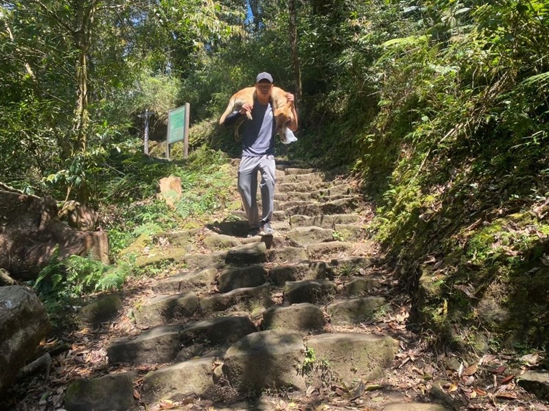嘉義縣長翁章梁公開徵求愛心認養人,希望給親人的身障浪浪大黃一個溫暖的家。圖為3月接獲山友通報後,人員將打了麻醉的狗狗扛下山救治。圖/嘉義縣府提供