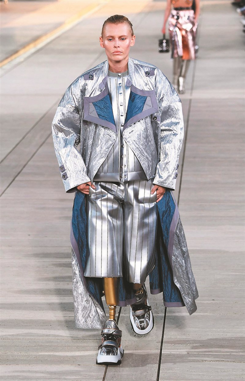 【本報綜合外電報導】時尚品牌LV日前於美國聖地牙哥舉辦二○二三早春時裝秀,其中,女模沃瑟(Lauren Wasser)五官高冷、身穿銀色套裝,但她的雙腳竟是一雙金光閃閃的義肢,最後謝幕時,她領著模特兒行列走出,展現出不服輸的生命鬥志,獲得全場喝采。