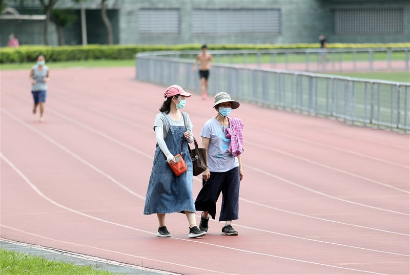 國內疫情持續延燒,許多民眾戴好口罩在新莊運動公園跑步、散步。圖/中央社