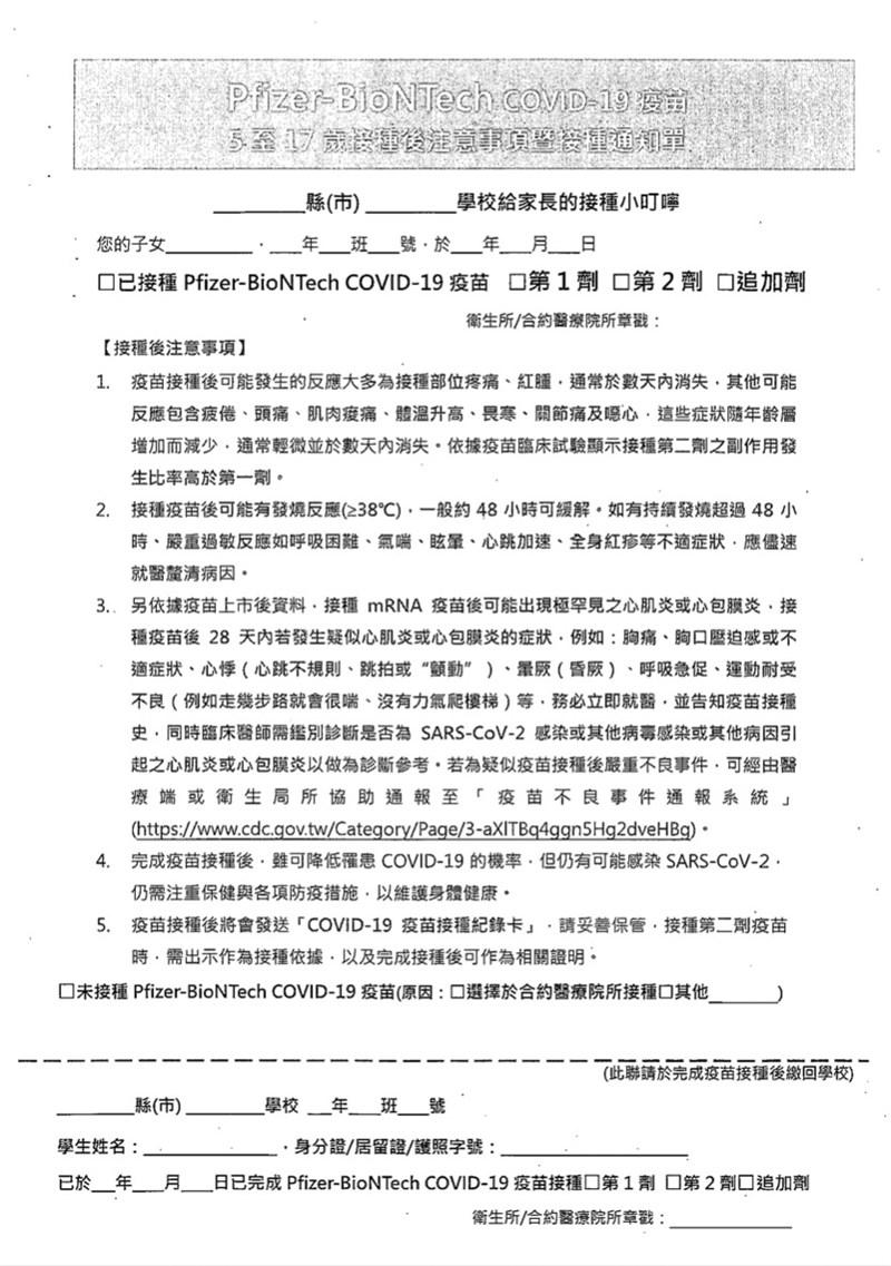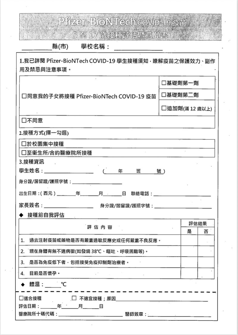 兒童、青少年接種BNT 最快5月25日開打 |2022.05.17 語音朗讀 858觀看次 字級 大 中 小 BNT疫苗已運抵台灣,5~11歲接種BNT疫苗同意書在今日曝光。圖/澎湖縣政府提供 【本報台北訊】教育部今(17日)發函通知各地方教育局處,有關滿5~17歲兒童及青少年接種BNT疫苗相關事宜。其中,滿5~11歲兒童基礎劑,請各地方政府及學校協助調查校園集中意願,提供家長評估及意願書,並視5月2日開始接種莫德納的量能統籌規畫排程;12~17歲追加劑接種則比照基礎劑方式回收接種意願。教育部表示,有關兒童及青少年接種BNT疫苗作業,請地方政府與轄區衛生所從5月25日起逐序推動,但建議以5至11歲為優先推動,其後再依量能安排12~17歲青少年追加劑接種。教育部今(17日)發函通知各地方教育局處,滿5~17歲兒童及青少年接種BNT疫苗相關事宜。圖/趙宥寧教育部表示,將推動5~11歲兒童接種BNT疫苗基礎劑,另依據疫苗接種後監測相關數據,建議兩劑間隔為12周。另為了加強青少年的保護力,建議完成基礎劑且無嚴重不良反應的12~17歲青少年族群,與最後一劑基礎劑接種後間隔至少5個月(150天)後接種追加劑。針對滿5~11歲兒童基礎劑接種,教育部說明,請各地方政府及學校協助調查校園集中意願,提供家長評估及意願書,由學校收回並彙整統計意願人數,同時提供轄區衛生單位造冊,後續接種期程,請視5月2日開始接種莫德納的量能統籌規畫排程。滿五歲為入小學的兒童,則由地方政府協調安排至合約醫療院所接種。另針對12~17歲青少年接種追加劑,教育部表示,將比照基礎劑的調查意願模式,也請地方政府及學校先行搜集接種意願,請家長詳細填寫各項必要欄位資訊後,由學校收回並彙整統計人數。教育部表示,有關兒童及青少年接種BNT作業,請地方政府與轄區衛生所協調自今年5月25日起逐序推動,考量兒童免疫保護力尚未完整,建議優先推動5~11歲兒童基礎劑接種作業,其後再依量能安排12~17歲青少年追加劑接種。對於尚未接種基礎劑的滿12歲青少年,也可安排併同校園接種,或協調合約醫療院所辦理。 前一篇文章 派特漢堡 推出全新創意花生口味 下一篇文章 第一執行長榮退 收下員工超過三千萬價值「禮物」 熱門新聞 01【閃文集】 駝峰天使2025.11.0402台中新社花海 重現經典卡通2025.11.0603南天寺30周年口述歷史 登英國期刊專欄2025.11.0304十方禪林40周年 教界高僧大德同賀2025.11.0305旅人心靈寶典《365日》 贈台中通豪大飯店 2025.11.0306看見 電子 穿牆而過 2025.11.0307一針一線60載 林全誠繡出神韻人生2025.11.0308【傾聽你我他】別為金錢傷感情2025.11.0309【觀我望己】 追日,散策旅程(上)2025.11.0310【民俗資產】 山林守護者:阿里山受鎮宮2025.11.03 訂閱電子報 台北市 天氣預報 台灣一週天氣預報 相關報導 興達電廠 應變演練澎湖馬祖包機 空中交通創舉中興新村活化 省主席官邸變身餐廳翡翠水庫支援發電 台電須付補償費林信義:台灣於APEC能見度提升國軍裝備採購 證實5案延宕