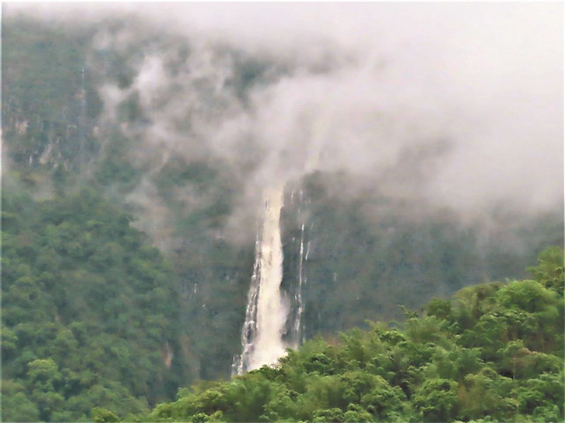 連日降雨,昨日趨緩,隱蔽在雲霧中的蛟龍瀑布,也在雲霧中顯現,彷如一幅山水畫,加上當地的山嵐雲影,美不勝收,讓拍下美景的豐山村「觀景民宿」莊主許銘月讚歎不已。