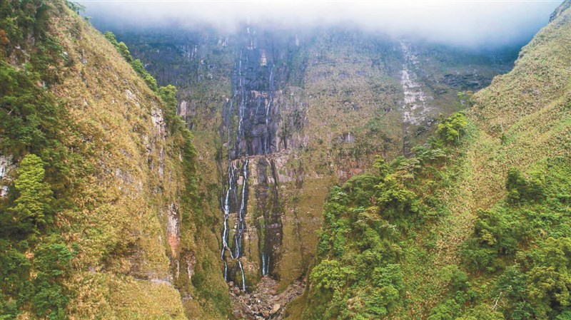 【記者江俊亮嘉義報導】滯留鋒面帶來連日降雨,有「台灣第一高瀑」之稱的阿里山蛟龍瀑布,也因豐沛的雨量,水量大增,猶如一條白練從塔山頂傾瀉而下,氣勢磅礴,與枯水期的涓涓細流相比,不可同日而語,被當地居民戲稱為「雨後限定版」。