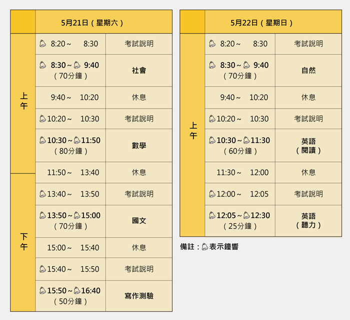 國中會考整理包 各科重點、防疫規定看這裡 曾博群 |2022.05.18 語音朗讀 3828觀看次 字級 大 中 小 國中教育會考考試日期為5月21日及5月22日,本報統整「會考整理包」,供考生及家長了解各科重點及防疫規定。圖/胡經周 【記者曾博群綜合報導】111年國中教育會考考試日期為5月21日及5月22日,國內校園本土疫情延燒,教育部16日表示,確診尚未解隔離、快篩陽性未經PCR檢驗及未獲PCR檢驗結果之考生參加補行考試,國中會考補考日將訂於6月4、5日,參加補考的考生將採外加名額方式,不影響其他考生權益。● 111年國中教育會考 考試科目及時間表5月21日(六):08:30~09:40 (70分鐘)社會10:30~11:50 (80分鐘)數學13:50~15:00 (70分鐘)國文15:50~16:40 (50分鐘)寫作測驗5月22日(日):08:30~09:40 (70分鐘)自然10:30~11:30 (60分鐘)英語12:05~12:30 (25分鐘)英聽圖/國中教育會考全國試務會● 111年國中會考成績計算方式會考將考生的成績由高到低,區分成 A、B、C 三個等級。其中同一等級中,又分為「++」 和「+」2 種標示。++:指該級距中,排名前 25% 的考生+:指該級距中,排名 26% 至 50% 的考生精熟A++ 精通熟習該科目國中階段學習的知識與能力,且為精熟等級前25%A+ 精通熟習該科目國中階段學習的知識與能力,且為精熟等級前26%-50%A 精通熟習該科目國中階段學習的知識與能力基礎B++ 具備該科目國中階段之基本學力,且為基礎等級前25%B+ 具備該科目國中階段之基本學力,且為基礎等級前26%-50%B 具備該科目國中階段之基本學力待加強C 尚未具備該科目國中教育階段之基本學力圖/Unsplash● 111年國中教育會考 各科重點解析國中會考各科衝刺解析,由補教業指點考生最新命題趨勢、必考重點及答題訣竅,協助考生事半功倍拿高分。此外,也針對校園防疫整理相關QA,盼能幫助讀者釐清疑惑。● 相關報導會考考完首日快篩陽 補考科目可自選、兩成績擇優國中會考確診生可補考 6月4、5日進行公布解隔起訖日算法 教部:確診生勿違規應考圖/資料照片● 會考大補帖國文準備由小至大 寫作確立題目核心英文出題靈活 答題謹慎多推敲數學掌握章節核心 基礎運算得熟練自然基礎概念整合 圖表掌握題幹方向社會考題聚焦台灣 掌握時間軸脈絡答題 前一篇文章 新北授權學校因地制宜 視需求暫停實體課程 下一篇文章 這波疫情衝擊服務業 比去年三級警戒更慘 熱門新聞 01尋光2025.12.0402【閃文集】 威尼斯印記2025.12.0203淡水、基隆、汐止21萬戶停水 爆民怨2025.12.0204印尼棉蘭水患 佛光人送物資救援2025.12.0205阿聯駐馬大使館國慶宴會 佛光山受邀出席2025.12.0206大馬豪雨洪災 佛光山馳援送暖2025.12.0107苗栗.三灣 樟之細路賞翠景 茶鄉續寫客家情2025.12.0108東南亞洪災 逾1100死、400萬人受災2025.12.0209全球復蔬 寶塔寺佛光人公益健走2025.12.0210南天大學澳洲佛教研究項目 實地考察圓滿2025.12.01 訂閱電子報 台北市 天氣預報 台灣一週天氣預報 相關報導 財劃法覆議案 立法院否決涉詐千餘案 內政部封小紅書1年盧秀燕:第3次政黨輪替 對人民應是好事藍白擋下1.25兆軍購 暫緩列案默克高雄半導體園區落成 鎖定AI晶片秋鬥遊行 高喊反戰求生救台灣 作者其他文章台首創AI步行機器人 加速中風患者復健肌少症非銀髮族獨有 研究籲篩檢提前至50歲林惠理2萬葉材築葉語 永續呈現大地語言華文文學星雲獎 隱地獲貢獻獎台灣永續行動獎 人間福報獲金、銅獎工研院攜故宮 用AI秀經典名畫