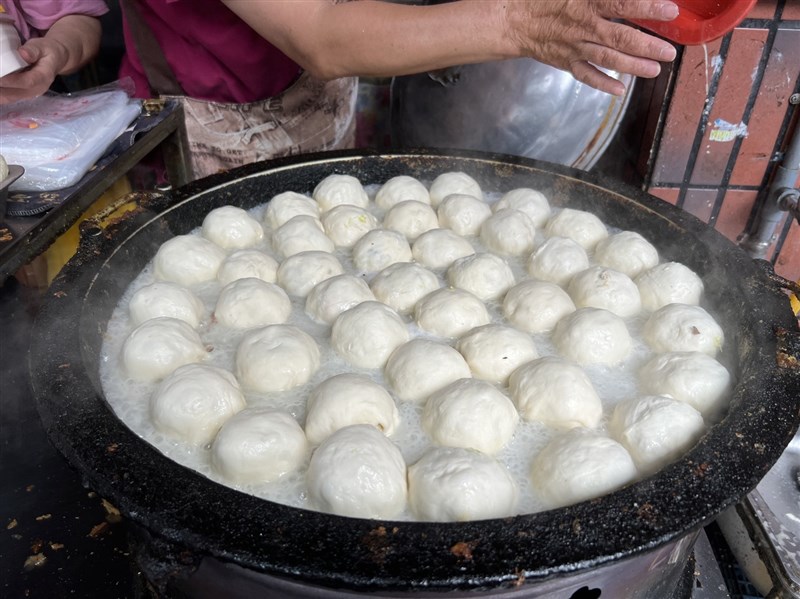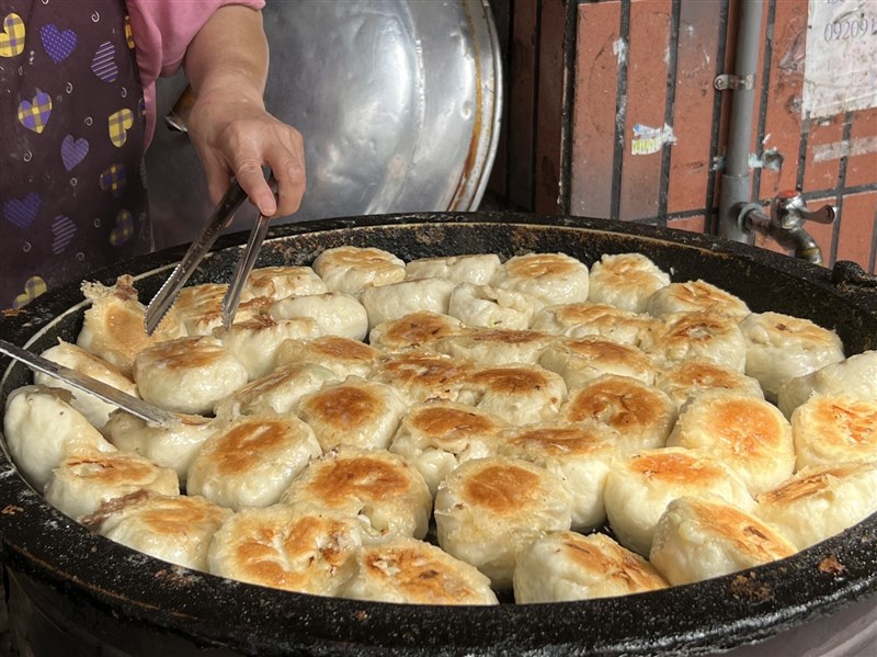 水煎包煎的雙面酥酥脆脆的,一起鍋許多民眾就「聞香而來」。圖/記者楊旻芳