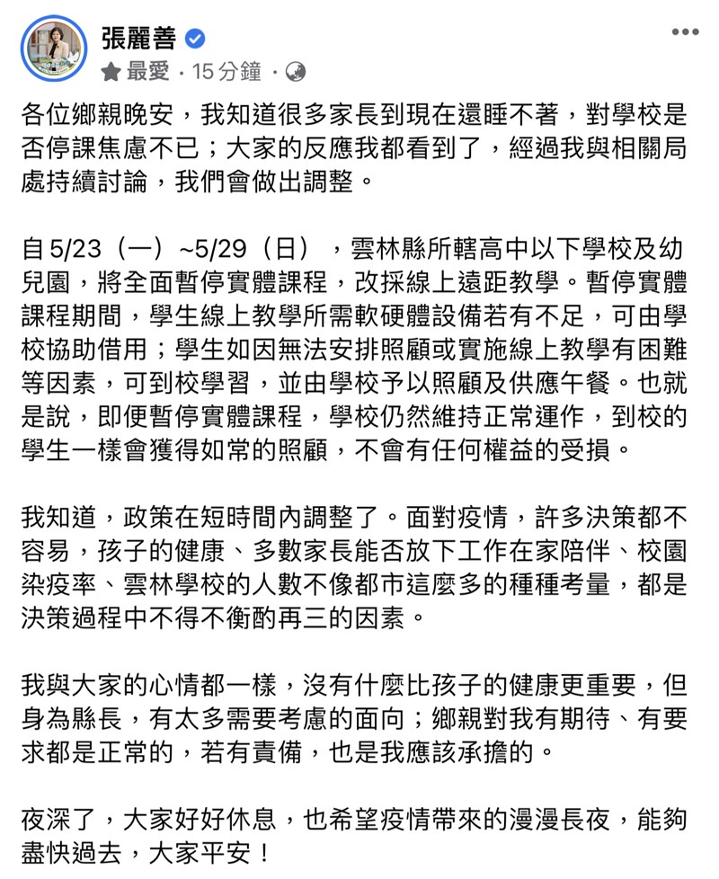 但仍有許多家長憂心到無法入眠,湧入張麗善臉書表達意見。張麗善深夜更新發文指出,「5月23日至5月29日雲林縣所轄高中以下學校及幼兒園,將全面暫停實體課程,改採線上遠距教學。」