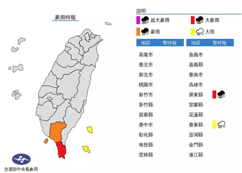 【本報綜合報導】中央氣象局發布豪雨特報,南方雲系影響,易有短延時強降雨,今(20日)恆春半島有局部豪雨或大豪雨發生的機率,屏東縣有局部豪雨或大雨發生,蘭嶼及綠島有局部大雨發生,注意雷擊、強陣風及溪水暴漲,低窪地區慎防淹水。