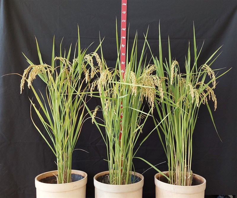台大高雄1號(中)尚具不易倒伏、秧苗期耐寒性及米粒外觀佳的特點。圖與台稉9號(左)及輪迴親高雄145號(右)的株型比較。圖/高雄區農業改良場臉書