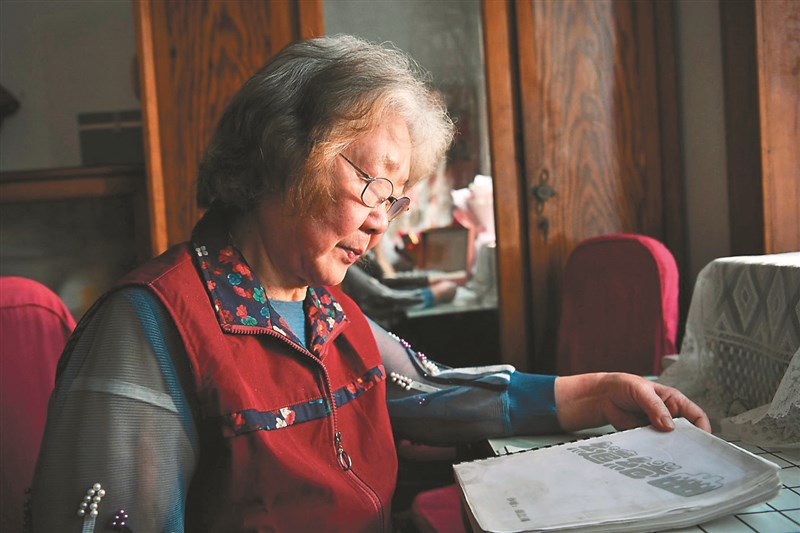 張愛蘭在安徽蕪湖的家中,閱讀自己寫的小說手稿《繾綣曲》。圖/新華社