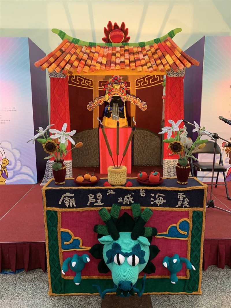 陳亞筑表示,她們總共花了一個月的時間製作,最大挑戰是因整座廟必須搬到戶外,毛線內的填充物都必須是不會吸水的材質,因此材質和立體結構都必須重新思考,而不只城隍老爺神明本尊,連神帽都是參考真正神帽製作出來,「最後我們還擲筊問老爺喜不喜歡,結果得到一個聖杯。」她開心分享。