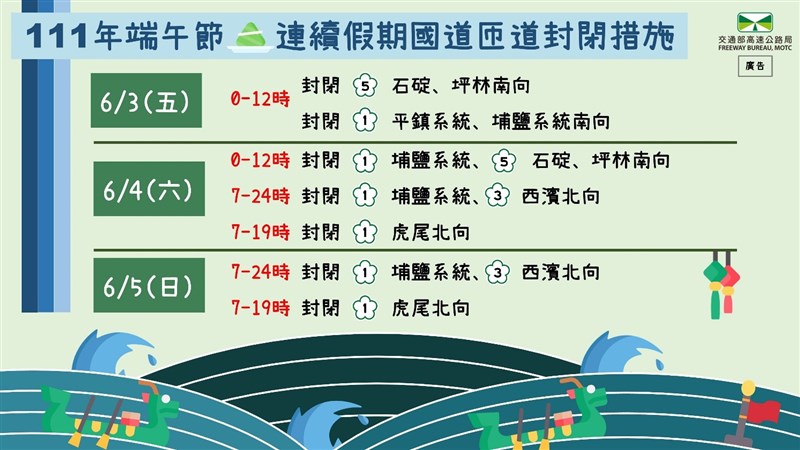 另端午節連假期間,國道亦有幾處交流道採時段性入口匝道封閉管制措施,高公局提醒用路人開車出門前,請做好車況檢查,及了解各項國道交通管制措施,並透過高速公路1968App查詢路況,避開壅塞路段及時段。高公局預祝大家端午節連假愉快、行車平安。