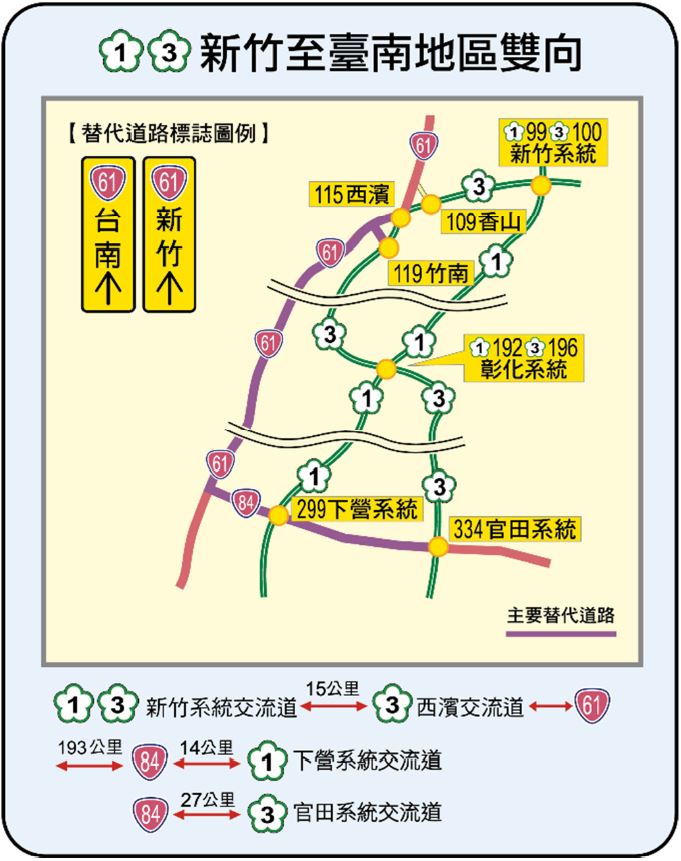 高公局說,北部欲往返中南部地區之民眾,可利用國3西濱交流道銜接台61線,避開國道中南部地區壅塞路段。往返國道新竹至台南路段民眾,高公局建議可從國道3號115公里處之西濱交流道直接銜接台61線行駛至台南地區;新竹至台南沿途之用路人,橫向可利用台72、國4、台61乙、台78、台82及台84與台61線銜接。
