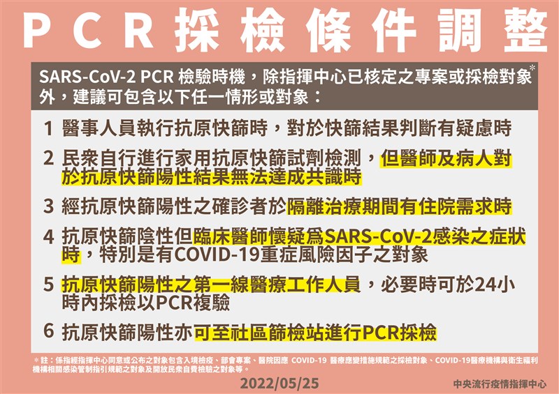 全民快篩陽即確診明上路 6狀況可PCR |2022.05.25 語音朗讀 2152觀看次 字級 大 中 小 全民「快篩陽即確診」明起上路。圖╱中央社 【本報台北訊】「快篩陽即確診」明起上路,指揮中心指揮官陳時中表示,5月26日起,不分年齡及族群,經醫事人員確認,或由醫事人員執行抗原快篩結果陽性者,即可研判為確定病例,不需再做PCR,但如果有些狀況要做PCR,可以到篩檢站採檢。指揮中心表示,因全台已進入大規模流行階段,為保全公衛防疫及PCR採檢量能,並利感染後易產生嚴重併發症或死亡高風險族群,盡速給予抗病毒藥物,降低病情惡化風險,因此修訂「嚴重特殊傳染性肺炎」病例定義,民眾使用家用抗原快篩試劑檢測結果陽性,不分年齡及族群,經醫事人員確認,或由醫事人員執行抗原快篩結果陽性者,即可研判為確定病例。發言人莊人祥表示,新制上路後,民眾可前往PCR採檢的狀況有6項,包括:1.醫事人員執行抗原快篩時,對於快篩結果判斷有疑慮時2.民眾自行進行家用抗原快篩試劑檢測,但醫師及病人對於抗原快篩陽性結果無法達成共識時3.經抗原快篩陽性確診者於隔離治療期間有住院需求時4.抗原快篩陰性但臨床醫師懷疑為新冠肺炎感染的症狀時,特別是有重症風險因子的對象5.抗原快篩陽性第一線醫療工作人員,必要時可於24小時內採檢以PCR複驗6.因目前為過渡期,因此抗原快篩陽性仍可至社區篩檢站進行PCR採檢PCR採檢條件調整。圖/中央疫情中心提供民眾預約視訊診療或前往社區篩檢站、醫療院所(含衛生所)請醫師現場評估確認快篩陽性結果時,請配合下列事項:1.自行快篩陽性後,於判讀陽性之檢測卡匣/檢測片,寫上檢測者姓名及檢測日期。2.將檢測判讀後之檢測卡匣/檢測片及健保卡放在一起拍照。3.如至診所請醫師確認,應以夾鏈袋或塑膠袋密封包好攜帶至診所。4.配合於醫師視訊或現場評估時出示判讀陽性之檢測卡匣╱檢測片。5.外出時務必佩戴口罩,請勿搭乘大眾交通工具,可自行開車、騎車、步行或家人親友接送(雙方應全程佩戴口罩)。指揮中心進一步提醒,屬於住家居家照護對象,以1人1室(單獨房間含衛浴)為原則,同為確診者得多人1室並進行7天隔離。每次浴廁使用後均適當清消,可於無獨立衛浴房間隔離。解隔後進行7天自主健康管理。北士科車來速PCR採檢。圖╱中央社 前一篇文章 急診2小時救回童 醫重見人性溫馨 下一篇文章 小巨蛋翻版?北藝中心周邊住戶批活動噪音震動地板 熱門新聞 01【分數之外】看見另一種英文2026.04.0802男子氣概照護員 日本長照新力量2026.04.0503【轉移注意力】往理想中的自己邁進2026.04.0504降雨兩樣情 南部水庫沒解渴2026.04.0605美課藥品重稅 台灣沒優惠 2026.04.0406一紙學歷換錢景 美學位價值遭質疑2026.04.0507租賃車業者違法攬客 觀光署:最高罰200萬元2026.04.0708【深頁凝視】《後院的鳥》凝神注視鳥兒登場2026.04.0509MLB鄧愷威拆彈 守住今井旅美首勝2026.04.0610暴雨狂炸苗栗 災情頻傳 2026.04.05 訂閱電子報 台北市 天氣預報 台灣一週天氣預報 相關報導 15%小琉球海龜曾受傷 癒合均需1年半古坑桐花季 18日浪漫登場清明豪雨 合歡溪出現新堰塞湖火金姑故鄉 賞螢好去處計程車掛牌費喊到35萬元 交部出手塑膠袋之亂 中南部缺貨嚴重