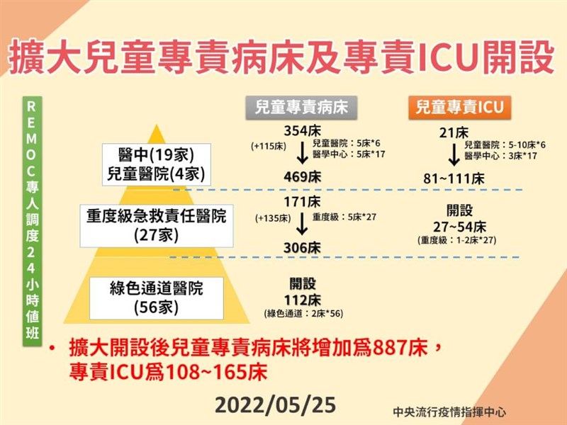 指揮中心醫療應變組組長石崇良表示,兒童專責加護病房已從21床加開到80床至100床,並以兒童醫院、醫學中心為主,盡可能搶救孩子。圖/指揮中心