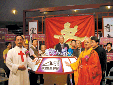 「有孝人間,宜蘭先行」活動昨天在縣議會舉辦啟動儀式,宜蘭縣佛教會理事長依融法師、宜蘭縣道教會理事長林征儀、天主教聖母醫院副院長高國卿以及勞工、農漁業、社大校長、教育界代表、一百零一歲人瑞黃金萬、學生、工商企業界代表、地檢署檢察長何明禎等人,一起按掌拉開系列活動序幕。(人間社記者葉黃素靜攝)