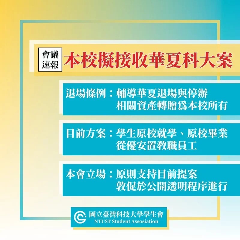 對於台科大「接收」華夏科大一案,台科大學生會表示原則支持,也同意目前校方以「適時舉辦公聽會,在資訊透明與共識下進行」的原則。但考量本案不同與台灣觀光學院、台灣首府大學等前例,相關審議程序也尚未明朗,本會將持續監督教育部與校方善盡溝通責任,落實公開透明原則。