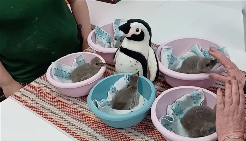 飼育員照顧五隻剛出生沒多久的企鵝寶寶,拿了一隻企鵝玩偶當奶爸奶媽陪身邊,讓小企鵝不感覺孤單。圖/取自推特