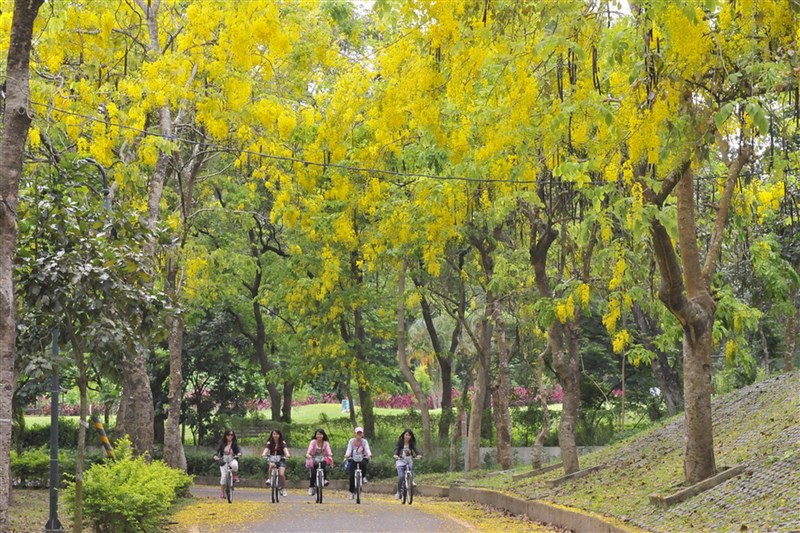 國境未開,交長盼觀光產業靠著國旅再撐一下,圖為台南虎頭埤阿勃勒花季。圖╱中央社