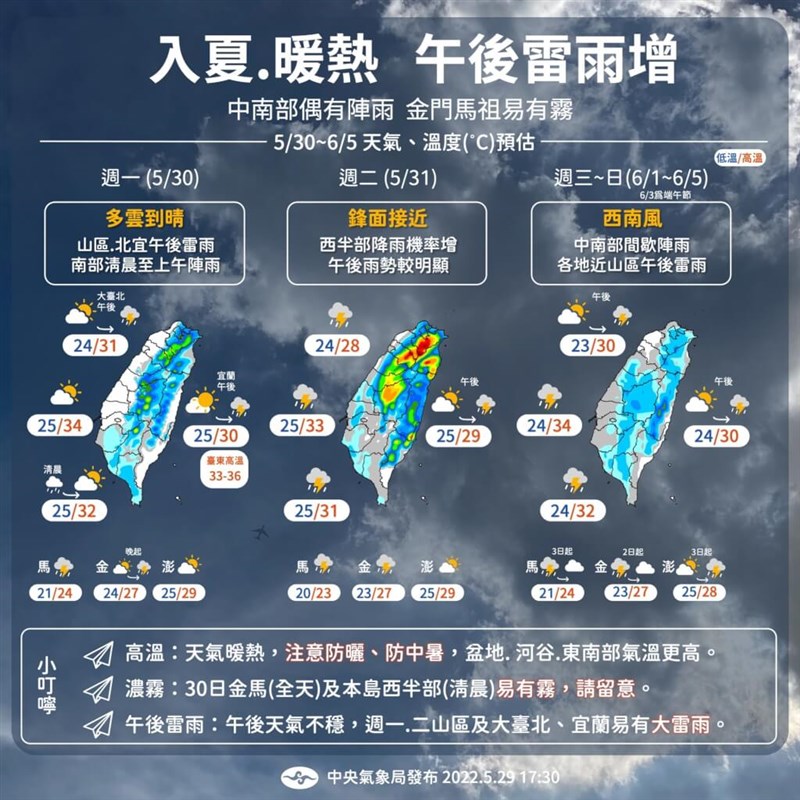 陳伊秀說,6月1日至5日鋒面北移,台灣轉為西南風的環境,帶來南方水氣,各地多雲到晴、易有午後雷陣雨,另外中部、南部有局部短暫陣雨或雷雨。