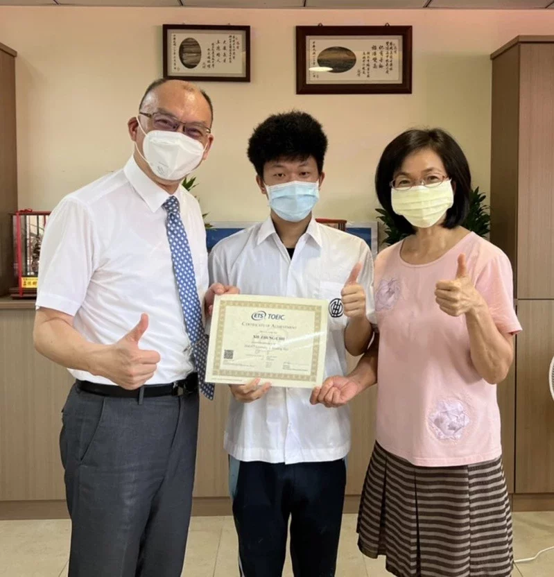 新北市雙溪高中學生謝宗萁(中)多益測驗945分,拿著證書與校長葉俊士(左)及英文老師李麗玲(右)分享喜悅。圖/雙溪高中提供