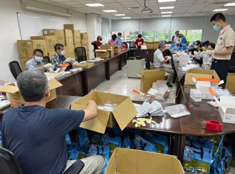 南投縣民政處也不輕鬆,快篩試劑、口罩、垃圾袋都是員工整箱包裝,從5月開始分裝人力就吃緊,包括處長吳燕玲在內,一有空就要幫忙打包。