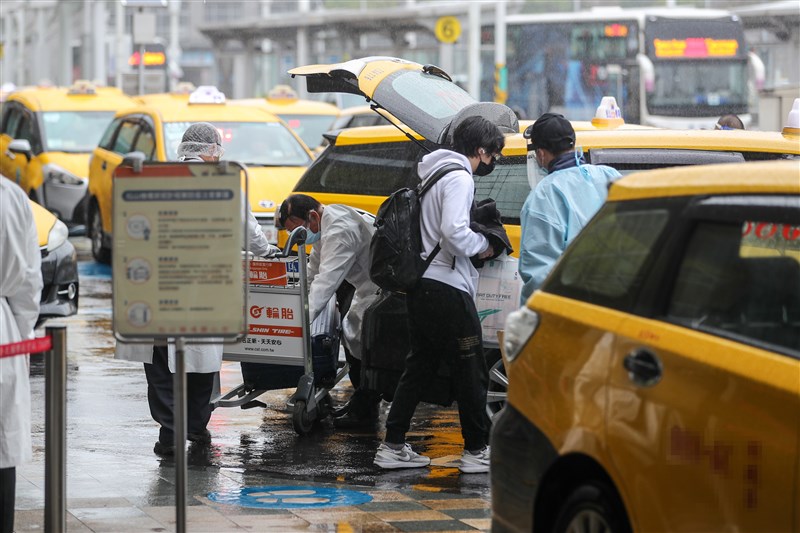 交通部研擬在邊境鬆綁後,除了防疫計程車,家人也能前往接送。圖為松山機場防疫計程車。圖/中央社