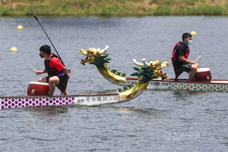 中央氣象局表示,3日各地大多為多雲到晴天氣,白天各地高溫約攝氏32至34度,局部地區有機會再高一些,天氣悶熱。圖為新北市議長盃龍舟錦標賽參賽隊伍上午在微風運河練習備賽。圖/中央社