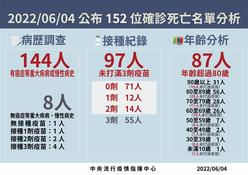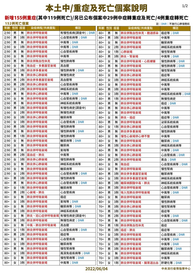 新冠確診人數雖趨緩 單日中重症、病歿創新高 |2022.06.04 語音朗讀 1015觀看次 字級 大 中 小 中重症個案496例、死亡個案增加152例,都創新高。圖/資料照片 【本報台北訊】今(4日)新增6萬8118例本土個案,中重症個案496例、死亡個案增加152例,都創新高。指揮中心發言人莊人祥表示,今天新增最小死亡個案,為一名1歲男童,本身有先天心臟疾病,長期臥床,確診後出現呼吸困難、低血氧,經搶救不治,從確診到發病不到4天。莊人祥表示,今天死亡個案152例中,年齡從未滿10歲到90歲以上,有144人有癌症等重大疾病或慢性疾病,有97人沒有施打三劑疫苗,有87人年齡超過80歲,其中死亡個案年齡最小,為一名1歲男童。圖/指揮中心提供莊人祥指出,1歲男童有先天心臟疾病,長期臥床住院,5月28日出現呼吸困難、低血氧,X光檢查右側肺部浸潤嚴重,經醫院採檢陽性確診,診斷為呼吸窘迫併右側肺炎,並轉到該院的負壓加護病房隔離,期間投藥瑞德西韋、類固醇、抗生素等,但男童病況不佳,5月31日病逝。另新增2名重症疑似腦炎兒童,包括5歲及6歲。莊人祥表示,5歲兒童是5月27日發高燒,期間有服藥但仍斷斷續續發燒,2天後5月29日才到醫院急診,收治加護病房,有用類固醇、瑞德西韋治療。圖/指揮中心提供莊人祥指出,6歲兒童則是6月1日出現發燒、意識改變,體溫升高到39.7度,到醫院採檢確診,經檢查為腦水腫,醫院投以降腦壓藥物及瑞德西韋,目前仍在治療中。目前國內兒童中重症累計34例,重症個案分別有17例腦炎、7例肺炎、2例敗血症、3例哮吼、4例家中死亡,1例腦腫瘤共病。其中14人死亡,包括5例腦炎、4例家中死亡、3例肺炎、1例敗血症、1例腦腫瘤共病。圖/指揮中心提供 前一篇文章 中職/悍將疫情燒到二軍 陳鴻文快篩陽性 下一篇文章 兒童疫苗接種時間可望縮短 最晚6月底決定 熱門新聞 01佛光山大學校長論壇 盼教育融入佛法2025.11.0802星雲大師全集⑲【佛教管理學②】禪門的管理法⑦2025.11.0803鳳凰將轉中颱 下周二雨勢最大2025.11.0804【養生百味】冬食淡素 防範疾病2025.11.0805電塔變身巨獸 奧地利新地標2025.11.0806陸航母福建艦服役 首採電磁彈射2025.11.0807更年力綻放 迎向第二黃金人生2025.11.0808高市早苗:台灣有事 日本擬行使集體自衛權2025.11.0809尼泊爾農民 古城晒稻米2025.11.0810【樹博士系列】土壤的祕密XV 水稻田減排新觀念IV 土地的溫柔革命 雲林大埤寫益生菌奇蹟2025.11.09 訂閱電子報 台北市 天氣預報 台灣一週天氣預報 相關報導 M1A2T將納入國軍指管系統修舊如舊 瑞三礦業整煤廠再生通霄電廠閃鳳凰 大煙囪「放倒」台近7成員工薪資 低於平均訪歐返台 蕭美琴:處境艱難不退縮魏哲家:黃仁勳來要更多晶片