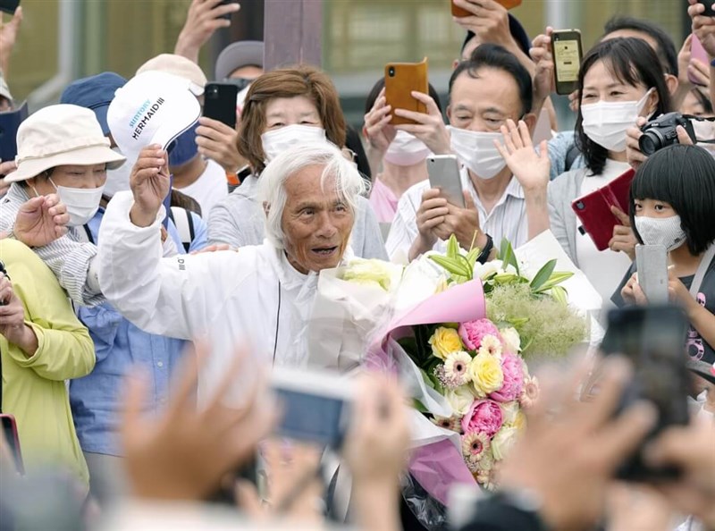 83歲日本海洋冒險家堀江謙一(前中,脫帽致意者)成功寫下以小型帆船「單獨不靠港」橫渡太平洋最高齡紀錄,他5日在返港儀式上表示「未來將繼續挑戰」。圖/共同社