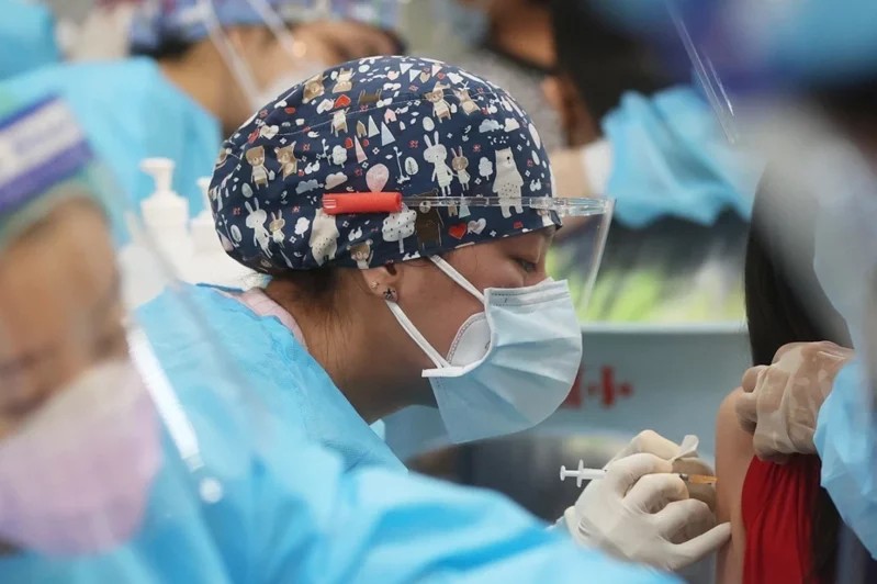 醫生呼籲家長趕快帶孩子去打新冠疫苗。圖為醫護人員為新北小學生接種BNT COVID-19兒童疫苗。圖/陳正興