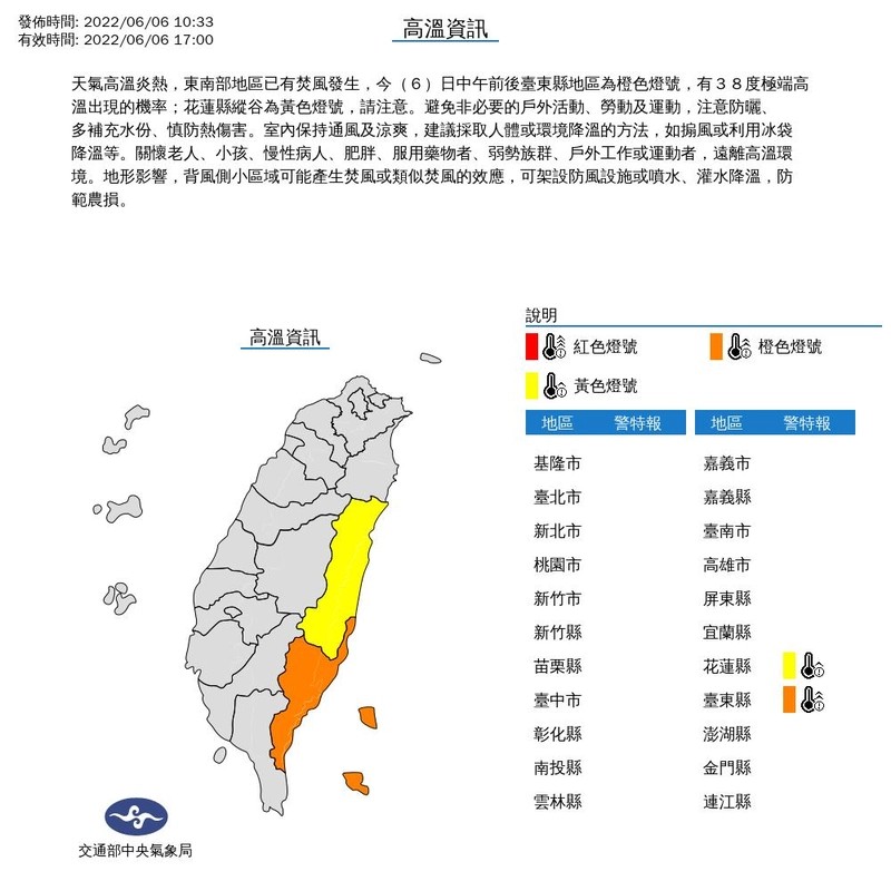 熱翻!東南部出現焚風 台東恐現38度高溫 |2022.06.06 語音朗讀 694觀看次 字級 大 中 小 (示意圖)中央氣象局表示,東南部已有焚風發生,且中午前後會出現38度以上高溫,提醒民眾留意。圖/民眾提供 【本報台北訊】中央氣象局表示,今日天氣高溫炎熱,東南部地區已有焚風發生,中午前後台東縣地區為橙色燈號,有38度極端高溫出現的機率;花蓮縣縱谷為黃色燈號,請民眾留意。中央氣象局表示,東南部已有焚風發生,且中午前後會出現38度以上高溫,提醒民眾留意。圖/中央氣象局提供 前一篇文章 北市今恢復實體課 9成小學7成中學到校 下一篇文章 北市恢復實體課程 防疫假僅占2.7% 熱門新聞 01記得與忘記2026.01.0802悍將、雄鷹補戰力 拚闖季後賽2026.01.0903運動後分泌的肌肉激素是萬能荷爾蒙2026.01.1004台水潮州營運所落成 佛光山灑淨2026.01.0905全球最長壽貓 30歲等同120歲人瑞2026.01.0806【聊聊心裡事】 三次免費諮商,怎麼用最有幫助?2026.01.1007社論--老宅延壽與老屋安住2026.01.1008常吃南瓜花椰菜藍莓 可緩解眼睛疲勞乾澀2026.01.0809南二監佛堂落成 佛光山灑淨祈福2026.01.1010【詩】爆紅2026.01.12 訂閱電子報 台北市 天氣預報 台灣一週天氣預報 相關報導 蔣經國逝世38周年 鄭麗文頭寮謁陵顧立雄:斷續收到墜海F-16黑盒子訊號搜救F-16飛官 海巡艦艇未發現油汙社宅跳票 擬助37.5萬空屋出租中捷橘線延伸海線 有譜F-16防撞系統列標配 明年全數安裝