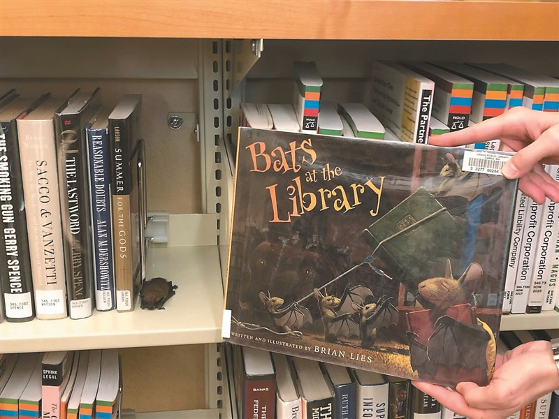 厄谷哈特拿一本名為《圖書館的蝙蝠》的書,與在書架上熟睡的蝙蝠合照。圖/取自網路