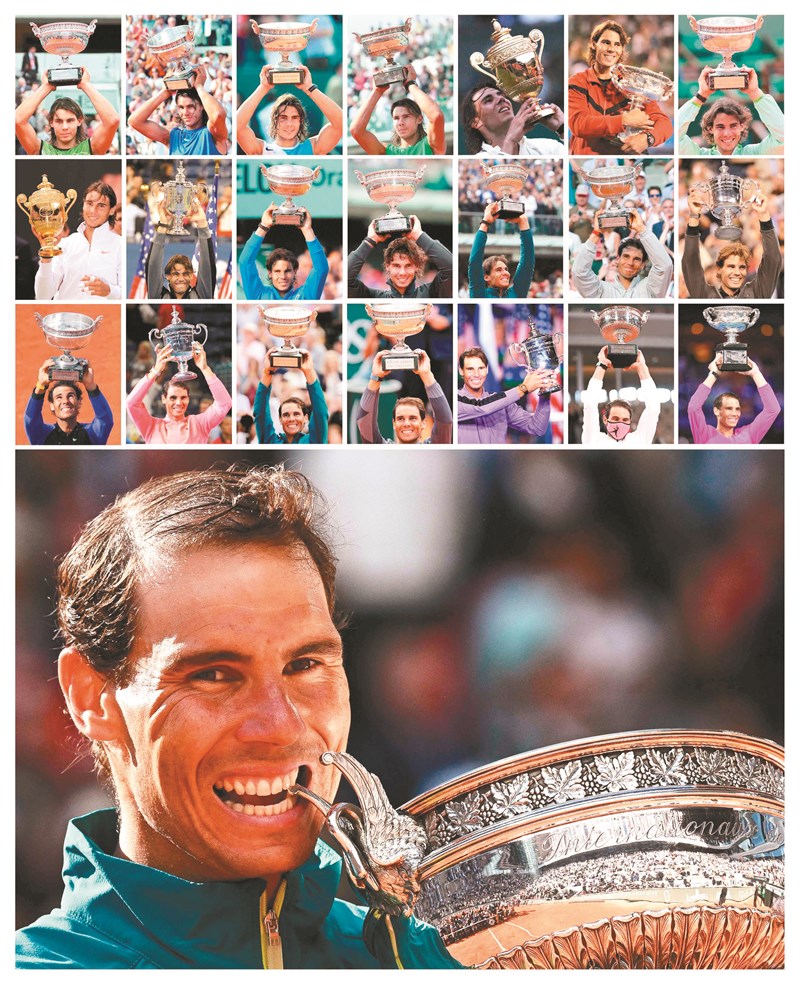 納達爾的22座大滿貫金杯:2005法網(左上開始)、2006法網、2007法網、2008法網、2008溫網、2009澳網、2010法網、2010溫網、2010美網、2011法網、2012法網、2013法網、2013美網、2014法網、2017法網、 2017美網、2018法網、2019法網、2019美網、 2020法網、2022澳網、2022法網。圖/法新社