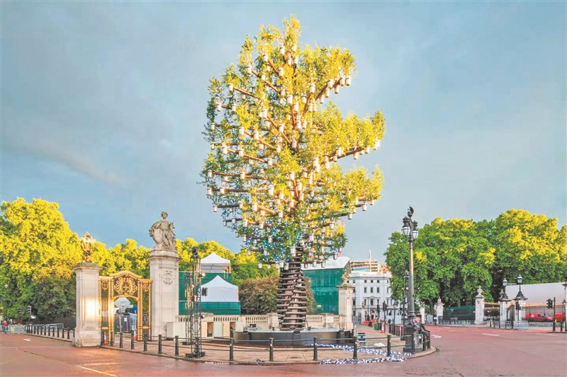 【本報綜合外電報導】英國海澤維克設計工作室(Heatherwick Studio)在倫敦白金漢宮外發表「Tree of Trees」裝置,用三百五十棵幼樹盆栽打造出一座二十一公尺高的樹木之塔「Tree of Trees」,做為女王伊麗莎白二世登基七十年的白金禧年慶祝活動「女王的綠色樹冠」(The Queen's Green Canopy)的一部分,盼望發揮拋磚引玉的效果,鼓勵大家為打造綠色環境一起努力。