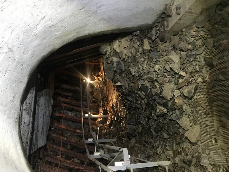 本山五坑去年5月因當地多雨氣候潮濕,坑道內木頭腐朽導致石塊崩落。圖/黃金博物館提供