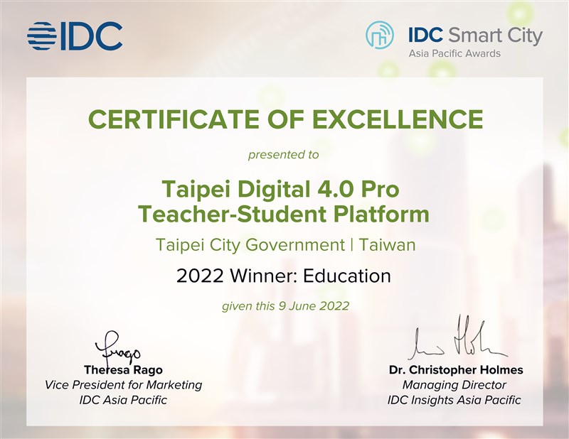 台北市教育局以「實現校園數位4.0的關鍵─親師生平台」參與IDC亞太區智慧城市SCAPA大獎。圖/台北市教育局提供