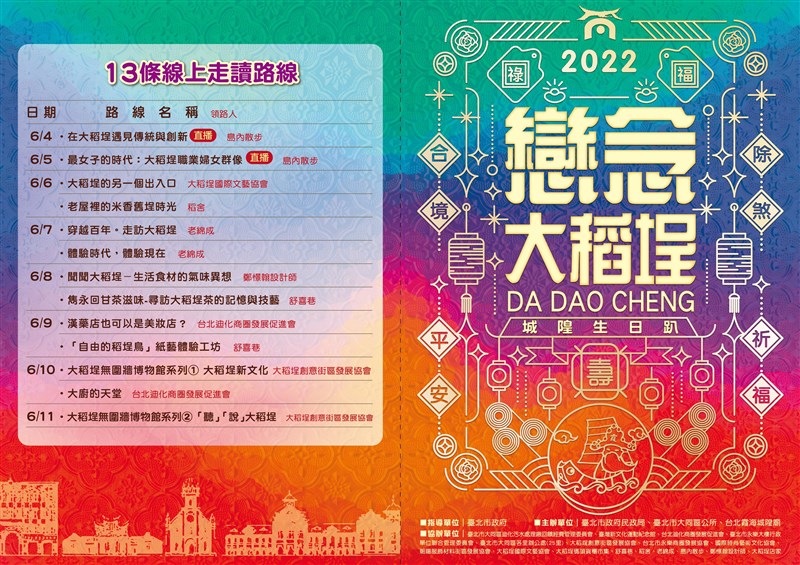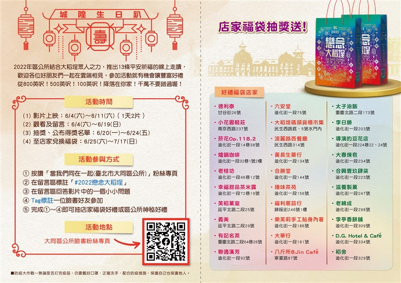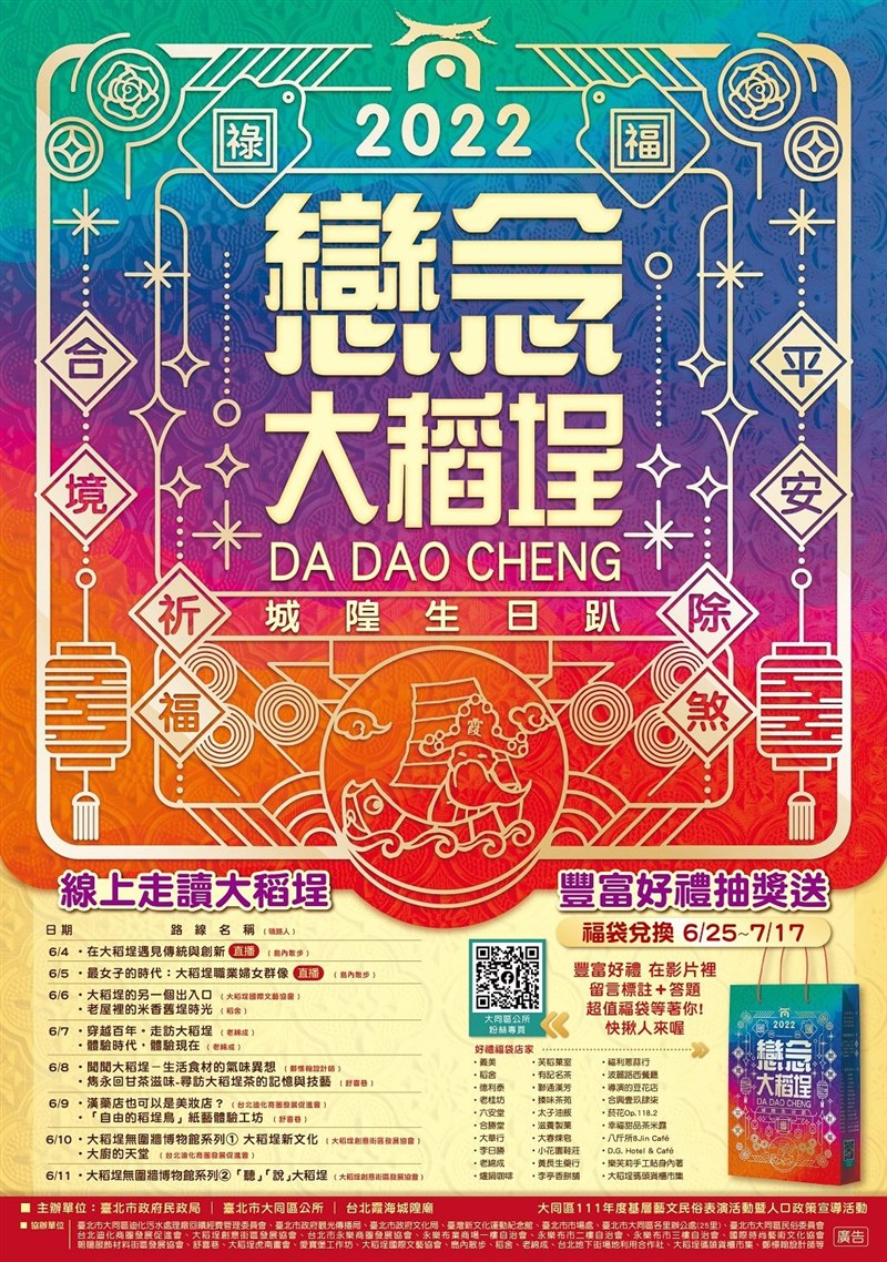 2022戀念大稻埕 抽出千份超值福袋 |2022.06.10 語音朗讀 1212觀看次 字級 大 中 小 圖/臺北市政府觀光傳播局 【記者楊旻芳台北報導】「2022戀念大稻埕—城隍生日趴」線上活動開跑,台北市大同區公所6月4日至7月17日,每日推出線上走讀活動,包含線上手作課程與導覽,讓民眾疫情不出門也能感受大稻埕風情,推出13條線上走讀路線,還有千份超值店家福袋好禮等您來抽獎,活動詳情請關注「當我們同在一起(臺北市大同區公所)」臉書粉專(https://www.facebook.com/DatongDO/)。今年戀念大稻埕線上走讀推出13條走獨路線,6月6日到11日每日皆會在大同區公所FB粉專上放映影片,透過影像的方式,將大稻埕的風華完整呈現給民眾,用雙眼開啟微旅行時光,帶民眾穿越百年走訪大稻埕,並且在每天的影片下方留言回答問題,還能抽大稻埕店家福袋,並且將於6月24日前公布得獎名單,6月25日到7月17日,則可憑中獎手機簡訊至店家兌換超值精美好禮。圖/臺北市政府觀光傳播局圖/臺北市政府觀光傳播局【2022戀念大稻埕—城隍生日趴 線上走讀路線】6/4 -在大稻埕遇見傳統與創新(直播)6/5 -最女子的時代:大稻埕職業婦女群像(直播)6/6 -大稻埕的另一個出入口-老屋裡的米香舊埕時光6/7 -穿越百年。走訪大稻埕 -體驗時代,體驗現在6/8 -聞聞大稻埕-生活食材的氣味異想-雋永回甘茶滋味-尋訪大稻埕茶的記憶與技藝6/9 -漢藥店也可以是美妝店?-「自由的稻埕鳥」紙藝體驗工坊6/10 -大稻埕無圍牆博物館系列1-大稻埕新文化-大廚的天堂6/11 -大稻埕無圍牆博物館系列2-「聽」「說」大稻埕6/11 -"電玩.動漫.公仔"台北地下街Y區.扭吧! 前一篇文章 民間捐3100劑快篩 助新竹縣遊民、獨居老人 下一篇文章 突然昏倒失去心跳 醫:身體好仍有心肌梗塞可能 熱門新聞 01最大規模無王日 逾3200場反川示威2026.03.3002宜蘭綠博會 探索真理2026.03.3003陸首都維安 北京全面管制無人機2026.03.3004MLB 鄧愷威轉隊太空人 初登板奪首勝2026.03.3005美首批陸戰隊抵中東 地面戰在即2026.03.3006乾旱嚴峻 雲林古坑春茶產量腰斬2026.03.3007北韓強化戰略武器2026.03.3008拉斐爾壁畫2026.03.3009昆士蘭協會 榮獲洛根市文化影響力獎2026.03.3010剛果文化壁畫2026.03.30 訂閱電子報 台北市 天氣預報 台灣一週天氣預報 相關報導 電梯按鍵怎麼取消? 網友指出還有這招基隆和平島阿拉寶灣5月開放 即日起可網路預約北捷引進南韓樂鐵電聯車 乘車空間更寬敞屏東藝起派對移師潮州 寫生比賽29日截止報名閒置多年轉型 花蓮鳳林新露營地4星高規格新景點「樹鼠」? 台南安平樹屋標成「tree mouse」