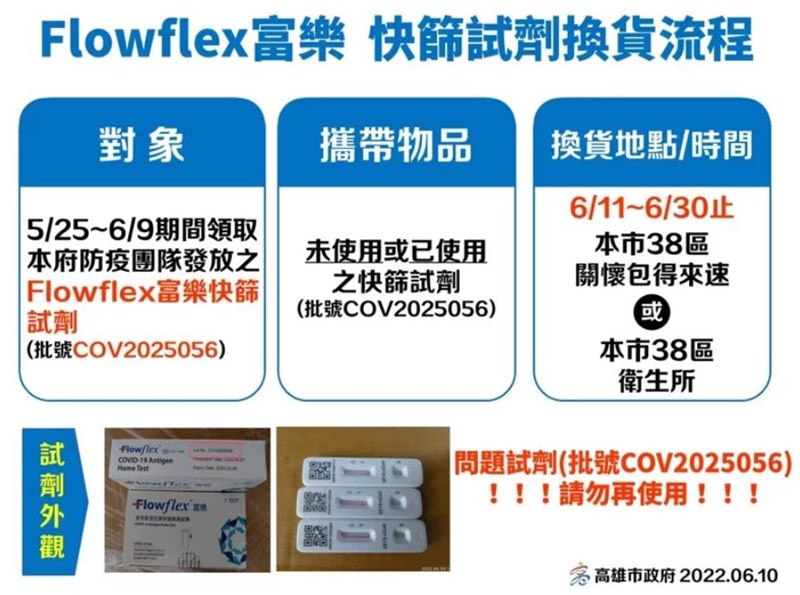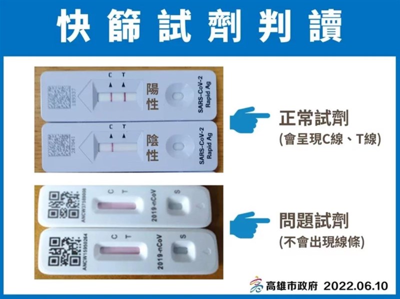 高雄市衛生局簡任技正潘炤穎表示,高市府收到台中衛生局相關通知,指美國富樂品牌測試線(T線)、品管線(C線)未同時出現,高市經查,同一批號庫存約十萬劑,已在5月25日到6月9日間發放出部分,儘管至今未接獲任何市民反映有問題,但基於慎重負責,市民領到此品牌快篩試劑,已用或未用者,都可到38行政區關懷包得來速換取新試劑。
