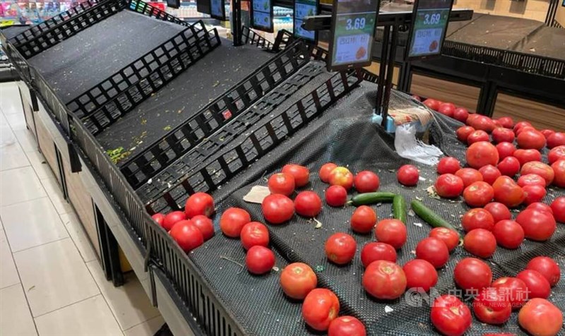 中央社記者實地走訪多個超市發現,雖然稱不上人山人海,冷凍食品、飲料零食、牛奶、民生用品等尚屬齊全,然而擺放蔬菜的貨架卻幾被掃空。