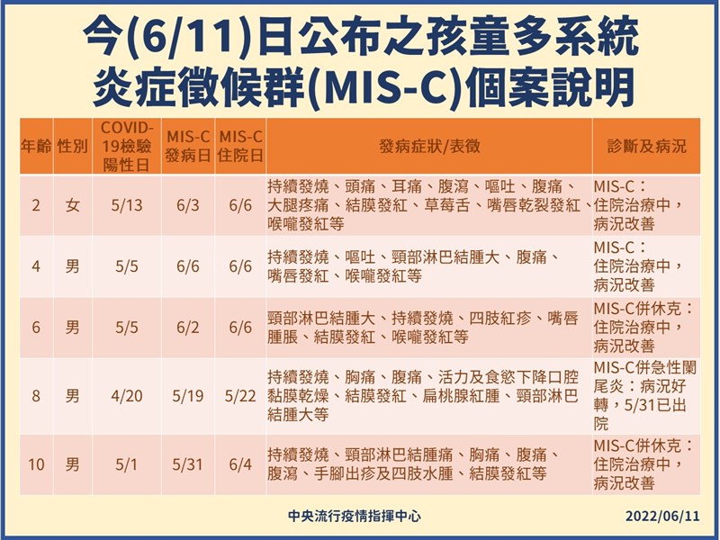 單日MIS-C暴增5例 最小為2歲女童 |2022.06.11 語音朗讀 836觀看次 字級 大 中 小 11日新增5例孩童多系統發炎症候群(MIS-C)個案,但確診日都是1個月前。圖/資料照片 【本報台北訊】國內今(11日)新增79598例新冠病毒本土病例,中重症案例446例,包括261例中症,185例重症,死亡個案新增211例,另新增5例孩童多系統發炎症候群(MIS-C)個案。指揮中心醫療應變組副組長羅一鈞表示,死亡個案年紀最輕30多歲男性,有慢性腎病,施打2劑疫苗,死因爲急性心肌梗塞、心律不整、肺炎。羅一鈞表示,今天新增211例死亡個案,年齡介於30至90多歲,有198人有慢性病史,141人沒打滿三劑,94人沒接種任何一劑疫苗,超過80歲的有105位長者。最年輕死亡個案為30多歲男性,曾接種兩劑疫苗,有慢性腎病、糖尿病,6月4日出現急性心肌梗塞,緊急送醫驗出新冠確診,病程急促,當天過世,死因急性心肌梗塞、心律不整、肺炎。圖/指揮中心提供另新增5例孩童多系統發炎症候群(MIS-C)個案,分別為4女1男,年齡介於2-10歲。羅一鈞提醒,雖然公布5人,但確診日都是1個月前,約4月底到5月中旬確診,當時都是輕症,距離確診後約3至4周左右出現新症狀。羅一鈞表示,最早的個案為8歲男童,4月20日確診,5月19日出現MIS-C症狀,包括持續發燒、胸痛、腹痛、活力及食慾下降口腔黏膜乾燥、結膜發紅、扁桃腺紅腫、頸部淋巴結腫大等,較特殊有合併急性闌尾炎,不需開刀經藥物改善,經治療已於5月31日康復出院。圖/指揮中心提供羅一鈞表示,最年輕為2歲女童,5月13日PCR採檢陽性,6月3日MIS-C發病,症狀有發燒、頭痛、耳痛、腹瀉、嘔吐、腹痛、大腿疼痛、結膜發紅、草莓舌、嘴唇乾裂發紅、喉嚨發紅等。目前國內兒童重症49例,MIS-C佔8個。圖/指揮中心提供 前一篇文章 醫生估未來MIS-C個案 還有可能更高 下一篇文章 15日起入境檢疫3+4 所有旅客適用 熱門新聞 01佛光山大學校長論壇 盼教育融入佛法2025.11.0802星雲大師全集⑲【佛教管理學②】禪門的管理法⑦2025.11.0803鳳凰將轉中颱 下周二雨勢最大2025.11.0804【養生百味】冬食淡素 防範疾病2025.11.0805電塔變身巨獸 奧地利新地標2025.11.0806陸航母福建艦服役 首採電磁彈射2025.11.0807更年力綻放 迎向第二黃金人生2025.11.0808高市早苗:台灣有事 日本擬行使集體自衛權2025.11.0809尼泊爾農民 古城晒稻米2025.11.0810【樹博士系列】土壤的祕密XV 水稻田減排新觀念IV 土地的溫柔革命 雲林大埤寫益生菌奇蹟2025.11.09 訂閱電子報 台北市 天氣預報 台灣一週天氣預報 相關報導 M1A2T將納入國軍指管系統修舊如舊 瑞三礦業整煤廠再生通霄電廠閃鳳凰 大煙囪「放倒」台近7成員工薪資 低於平均訪歐返台 蕭美琴:處境艱難不退縮魏哲家:黃仁勳來要更多晶片