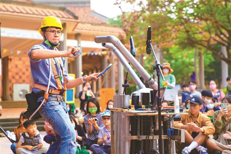 台中市逍遙音樂町昨登場,街頭藝人水管打擊樂演奏,吸引群眾目光。