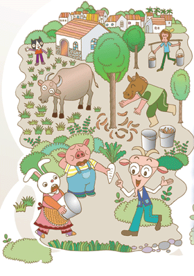 山羊村長又走呀走的,遇到了豬小弟。豬小弟說:「我家採收蘿蔔後,蘿蔔葉剩太多了,不知道該怎麼辦?」