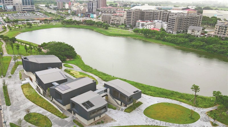桃園市獲2件金獎,橫山書法館(圖)以公園為「硯台」、埤塘為「墨池」的概念設計,建築外觀由5個如篆刻印章的方盒子組;大有梯田公園,則是全台首座以低環境衝擊工法打造的農村生活體驗公園。圖/桃園工務局提供