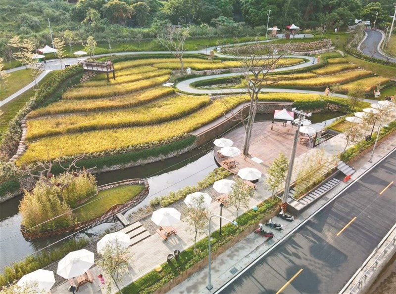 桃園市獲2件金獎,橫山書法館以公園為「硯台」、埤塘為「墨池」的概念設計,建築外觀由5個如篆刻印章的方盒子組;大有梯田公園(圖),則是全台首座以低環境衝擊工法打造的農村生活體驗公園。圖/桃園工務局提供