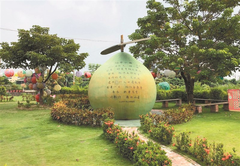 彰化香山社區與和美鎮還社社區改善地方髒亂點,將長期閒置土地打造為亮點,吸引外地人參觀,帶動地方發展,獲得有建築界奧斯卡之稱的「社區文化景觀營造類建築園冶獎」。圖為香山社區的柚香公園,以在地產業香山柚作為造型穀倉裝置藝術。圖/彰化縣政府提供