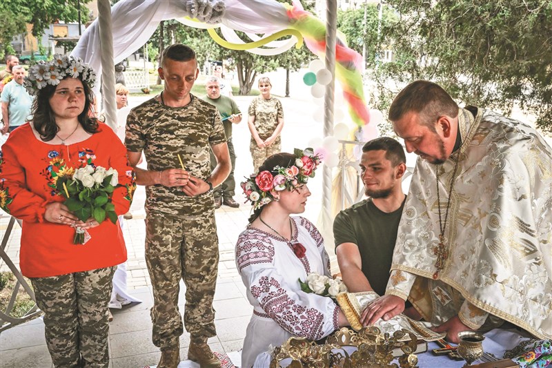 主持婚禮的神職人員告訴法新社,這是俄羅斯二月二十四日入侵烏克蘭以來,這個旅在戰時首辦婚禮,「現在還在戰爭,沒有時間舉行大型慶祝活動」。