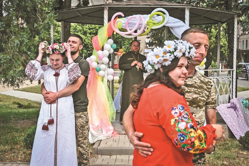 【本報綜合外電報導】俄烏戰爭已持續數個月,而儘管戰爭持續,民眾還是要過生活。烏克蘭軍隊十二日在東部前線戰鬥中休息片刻,為兩對情侶舉行婚禮。婚禮期間可聽到空襲警報響起三次,二位新娘捧著花束,其中一名新娘還穿著迷彩褲出席婚禮。