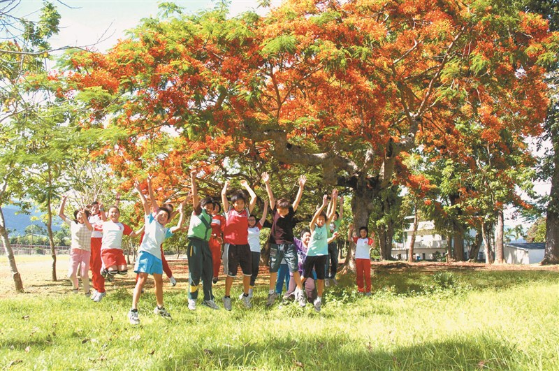 台東縣永安國小75年前創校時,種下逾20棵鳳凰木,每年5月開花後,校方會選一棵最漂亮的,在樹下拍攝畢業照,圖為2009年拍攝。但多年來樹木因改建砍除或染病移除,僅存的最後一棵今年也枯死,師生和村民不捨。校方今年讓最後一棵樹和同學一起「畢業」,13日舉辦鳳凰木老照片展,今天畢業典禮時,要讓學生用鳳凰木的木片寫下祝福,希望校樹走後,精神還在。圖/中央社
